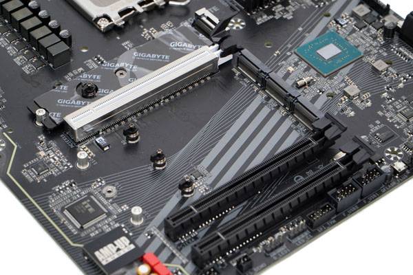 Z790 어로스 엘리트는 3개의 PCIe x16 슬롯이 들어가는데 맨 위에는 PCIe 4.0의 2배 대역폭을 가진 PCIe 5.0 x16 인터페이스와 스테인리스 스틸 PCIe 쉴딩 및 더블 록킹 브라켓으로 인장 강도가 향상되어 고사양 그래픽 카드에 최적화됐다. 또한 PCIe 이지 래치(EZ-Latch) 방식을 통해 백플레이트가 달린 그래픽 카드도 좀더 쉽게 분리할 수 있다.
