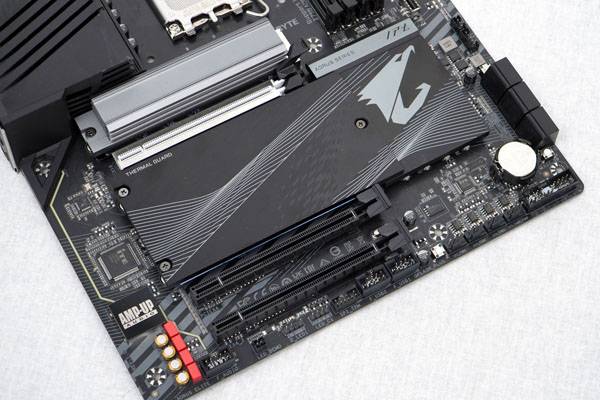 가장 윗쪽에 있는 'M.2 서멀 가드(Thermal Guard) III'는 6배 최적화된 방열 표면과 양면 M.2 방열판으로 구성되어 그래픽 카드와 CPU 쿨러 사이에 낀 위치에도 M.2 SSD의 스로틀링 및 병목 현상을 방지한다. 본래는 PCIe 5.0 SSD 발열을 고려한 설계였으나 Z790 어로스 엘리트는 PCIe 5.0 M.2 SSD를 지원하지 않으므로 일반 M.2 SSD보다 발열이 높은 고성능 모델이나 양면 M.2 SSD 같은 제품을 사용하기에 적당하다.