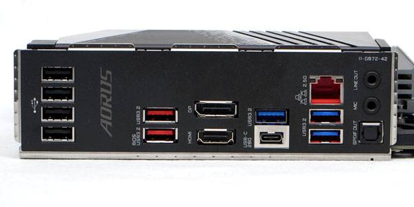 후면 I/O 구성은 좌측부터 4개의 USB 2.0 포트를 비롯해 붉은색 USB 3.2 Gen2 포트 2개, 내장 그래픽 출력을 위한 DisplayPort 1.2 및 HDMI 2.0 포트, USB 3.2 Gen 2x2 Type-C 포트, 3개의 USB 3.2 Gen1 포트, RJ-45 LAN 포트, 2개의 오디오 잭과 S/PDIF 광 출력 단자로 구성된다.