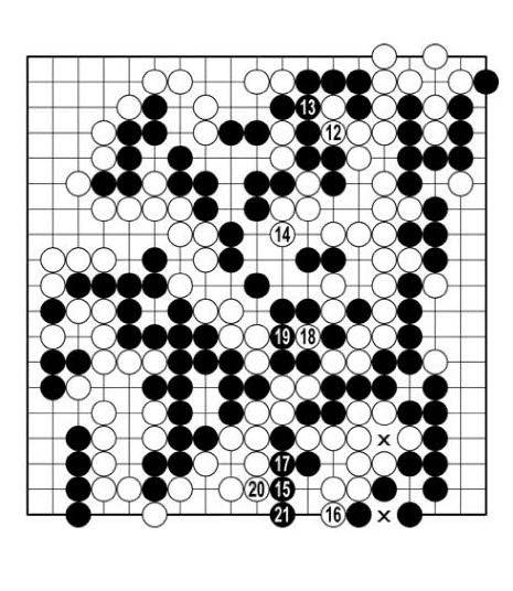 실전은 얘기가 달라졌다. 흑이 두 곳에 있는 패 '× '를 다 이겼다. 결국 흑21에 뻗은 돌이 빅으로 살아난 것이다. 바둑은 378수에 끝나 흑이 2집 반을 남겼다.