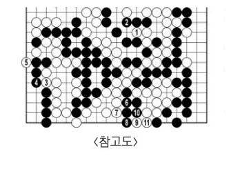 흑15 때 백16에 막은 것이 틀렸다. 15를 상대하지 않는 것이 가장 좋은 수다. <참고도>를 보자. 백5로 두어도 괜찮다. 흑6에 먼저 이으면 7에 막아도 백이 이기는 싸움이다. 11 옆에 패 모양이 있고 또 위에 패 모양이 있다. 흑이 두 곳 패를 다 이길 수 없으니 백이 흑 여섯 점을 잡은 꼴이다.