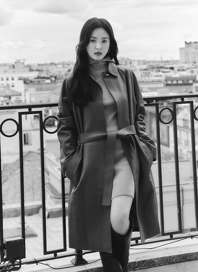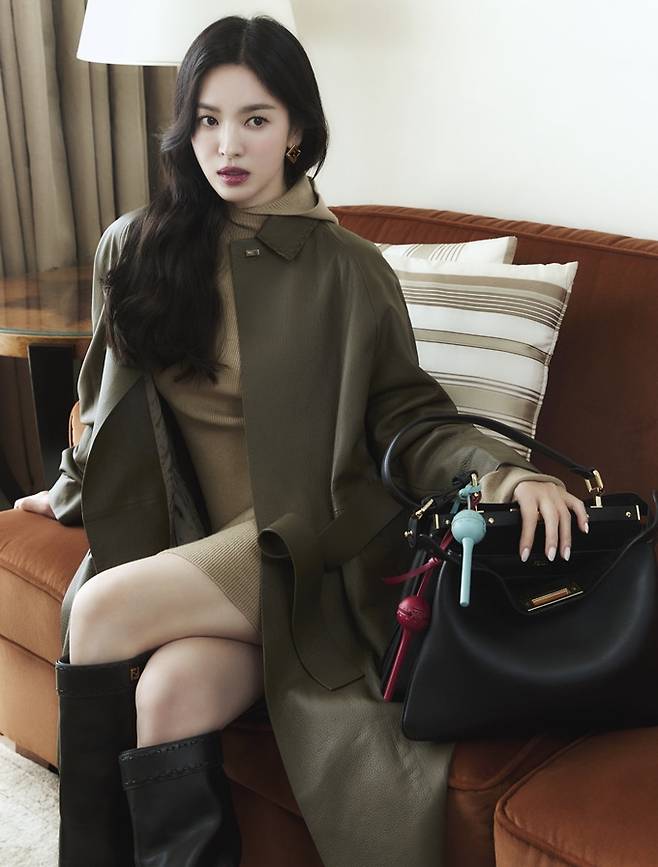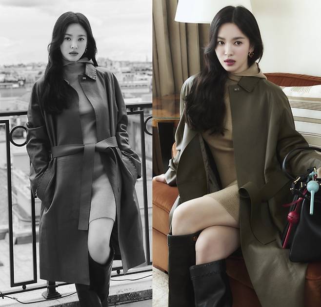 공개된 화보에서 송혜교는 베이지 컬러의 니트 후드 미니 원피스에 다크 그린 레더 트렌치코트를 입고 피카부 소프트 백을 매치한 럭셔리한 가을룩으로 시선을 사로잡았다.