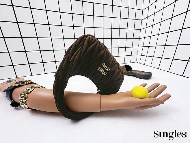 입체적인 마테라세 패턴을 새긴 스웨이드 소재 완더 백, 버클 장식 브레이슬릿과 기하학적 메탈 모티브의 가죽 브레이슬릿, 스웨이드 소재 클로그는 모두 가격 미정 미우미우.