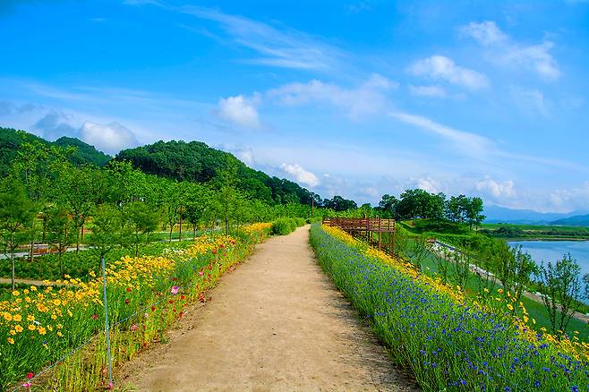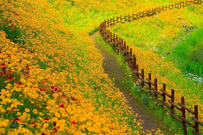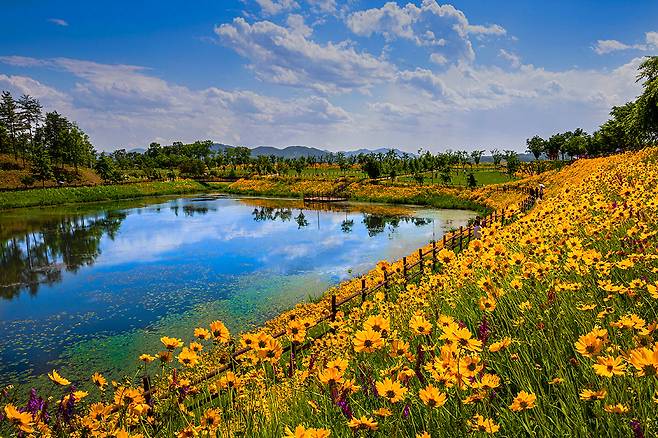 무엇보다 이곳의 백미는 전국에서 가장 길다는 둑방길이다. 본격적인 금계국 개화가 시작되는 5월 말부터 6월까지 수십만 송이의 꽃들이 일제히 피어나 노란 물결로 변신한다.