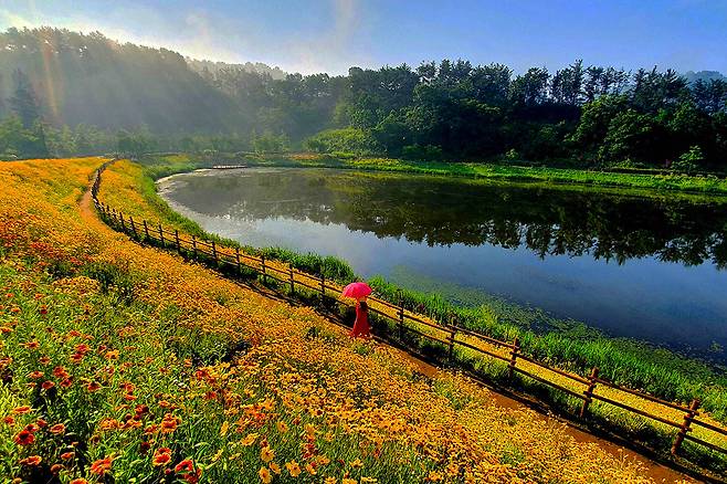 황금빛 꽃길은 걷는 이의 시야를 가득 채우고 그 속에 드문드문 피어나는 보랏빛 수레국화와 연못 위에 드리운 꽃 그림자는 어디에서 사진을 찍어도 '인생샷'이 보장되는 포토존이 된다.