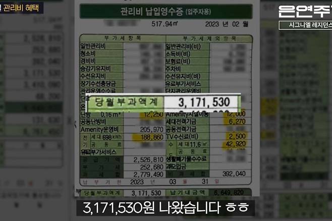 A 씨는 영상에서 “여기 살면서 단점? 월세요”라며 높은 월세가 단점이라고 꼽았다. 관리비와 부가세를 포함한다면 한 달에 3,000만 원 가까이 비용이 들어간다고 주장했다. 그러면서 A 씨는 “지난달 관리비가 490만 원이 나왔어요”라고 말하며 시그니엘의 높은 관리비를 명세서로 증명했다.