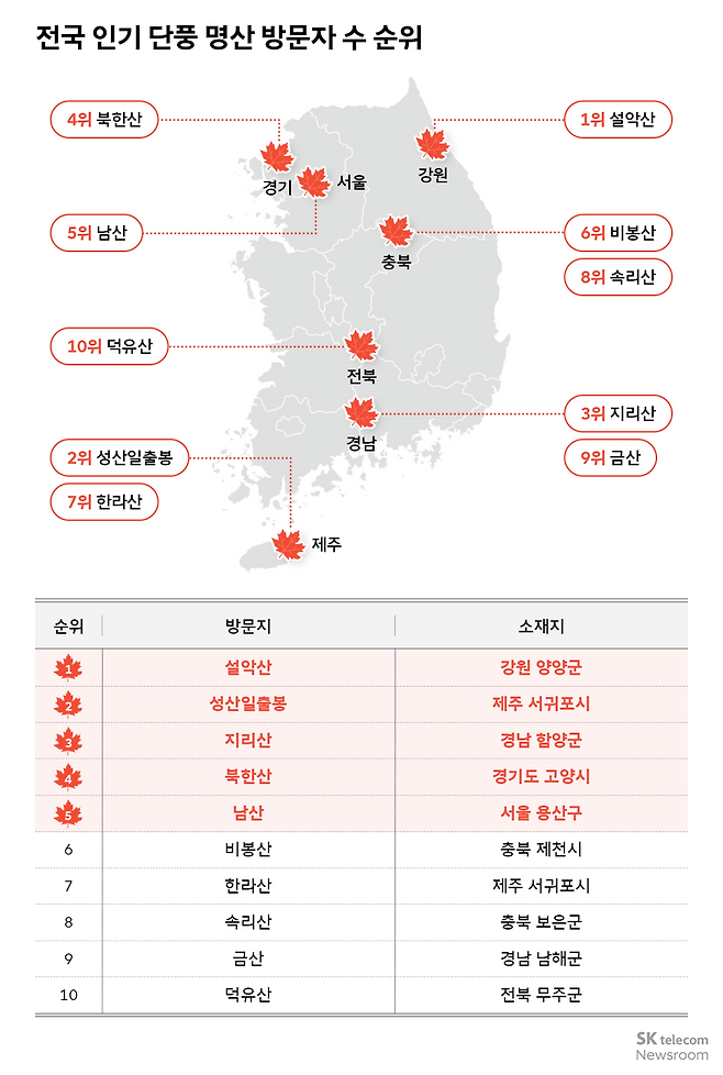 리트머스는 전국 인기 단풍 명산 방문객 수를 분석해 100위까지 순위를 매겼다. 그 결과, 지난해 단풍 시즌 가장 많은 방문객이 찾은 산 1위는 국내 대표적인 단풍 명산인 ‘설악산’으로 나타났다. 이어, 제주 성산일출봉, 지리산이 뒤를 이었다. 내륙이 아닌 제주권이 단풍 명소로 상위권에 오른 것이 눈에 띈다.