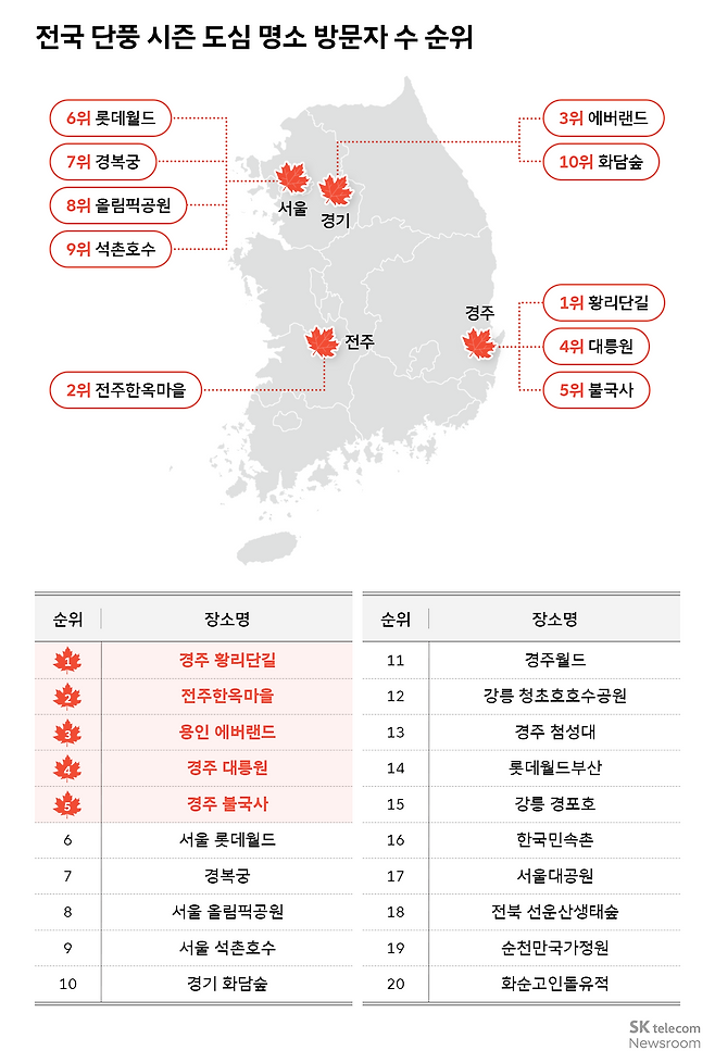 SK텔레콤의 AI기반 위치분석 플랫폼 ‘리트머스(LITMUS)’가 2024년 단풍 시즌 직전 기간 대비 체류객이 증가한 장소를 살펴봤다. SK텔레콤 뉴스룸에 따르면 단풍 시즌 가장 인기 있었던 도심 명소 1위는 경주 황리단길로 나타났다.
