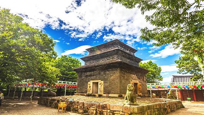 신라 선덕여왕 3년(634년)에 창건된 이 석탑은 현존하는 신라 석탑 중 가장 오래된 보물이다. 일반적인 화강암 대신 검은빛 안산암을 벽돌처럼 다듬어 쌓아 올린 독창적인 양식이 특징이며, 기단 모서리의 사자상과 인왕상은 그 정교함을 지금까지도 뽐낸다.