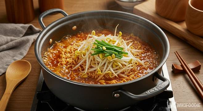 부추는 강한 향과 알싸한 맛이 있어 국물에 깊은 풍미를 더해준다. 황화합물이 포함되어 있어 면역력 강화에도 도움을 줄 수 있으며, 라면을 먹을 때 속이 더부룩한 느낌을 줄여주는 역할도 한다. 마지막에 넣어 1분 정도만 살짝 익히면 신선한 향을 살릴 수 있다.