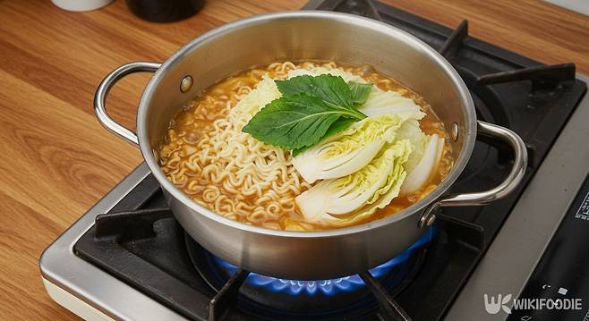 배추는 국물에 자연스럽게 스며들어 시원하고 깔끔한 맛을 낸다. 특히 배추에 있는 식이섬유가 기름진 국물의 텁텁한 느낌을 줄여주고, 소화를 돕는 역할도 한다. 배추는 라면이 끓은 후 23분 정도 지나 넣고, 12분간 더 익히면 적당히 부드러워진다.