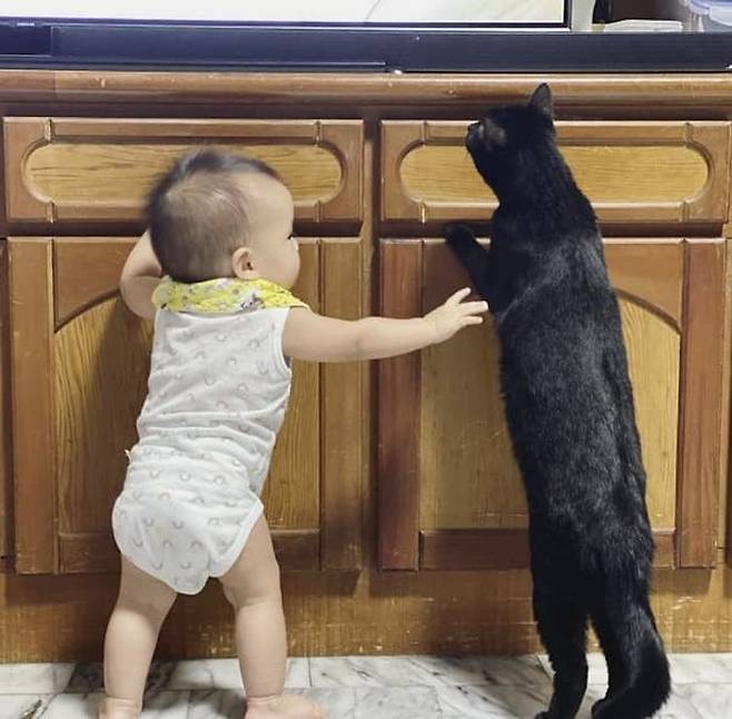 공개된 사진 속에는 검은 고양이가 TV 캐비닛 앞에서 태어난지 이제 막 9개월 차에 접어든 아기에게 어떻게 두 발로 일어서는지 시범을 보이고 있었죠.