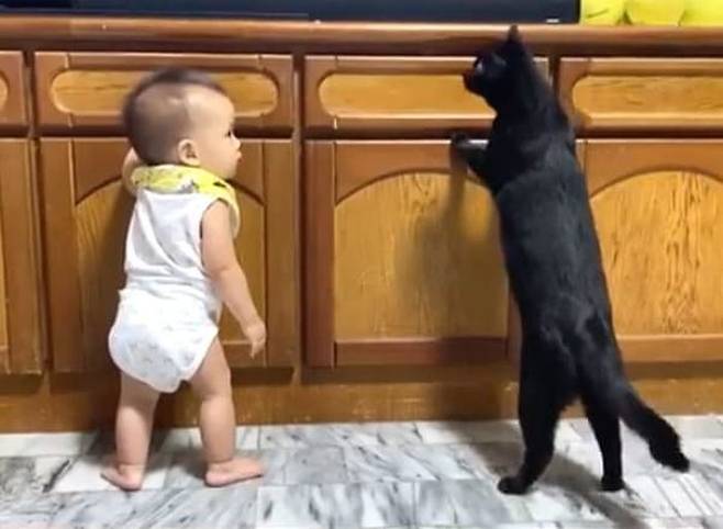 그렇게 아기는 고양이의 행동을 따라하며 두 발로 일어서는 방법을 터득했다고 하는데요. 아무리 보고 또 봐도 놀라운 조합이 아닐 수 없습니다.