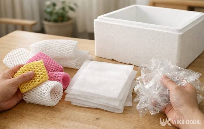 과일 선물 세트에는 보호재가 빠지지 않는다. 문제는 생김새가 비슷해 보여도 배출 방법이 다르다는 점이다. 과일 하나하나를 감싸고 있는 그물 모양 스펀지는 과거에는 재질이 불분명해 일반 쓰레기로 분류했으나, 최근 환경부 지침상 발포성 폴리에틸렌(EPE) 재질로 분리배출 표시가 있다면 스티로폼(폴리스티렌)과는 별도로 비닐류 또는 플라스틱류로 배출이 가능하다. 재질 표시가 없다면 일반 쓰레기로 버리는 것이 안전하다.