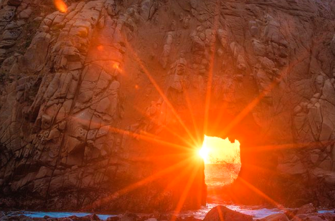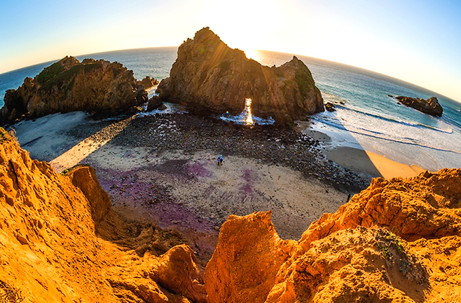 붉은 석양에 물든 바다, 보랏빛으로 물든 모래, 그리고 바위를 관통하며 황홀한 빛을 뿜는 자연의 문. 이 모든 풍경이 한 곳에 존재한다면, 과연 믿을 수 있을까요?