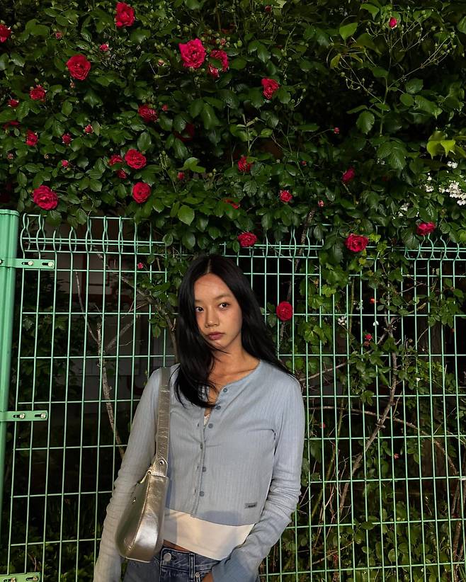 혜리의 데일리룩은 로맨틱한 무드가 강조된다. 은은한 블루 컬러의 버튼업 가디건과 실버 숄더백, 그리고 데님 팬츠로 산뜻하면서도 세련된 분위기를 연출하고 있다. 배경의 장미꽃과 조화를 이루는 컬러 선택이 눈길을 끈다. 심플하지만 여성스러운 스타일링이 돋보인다.