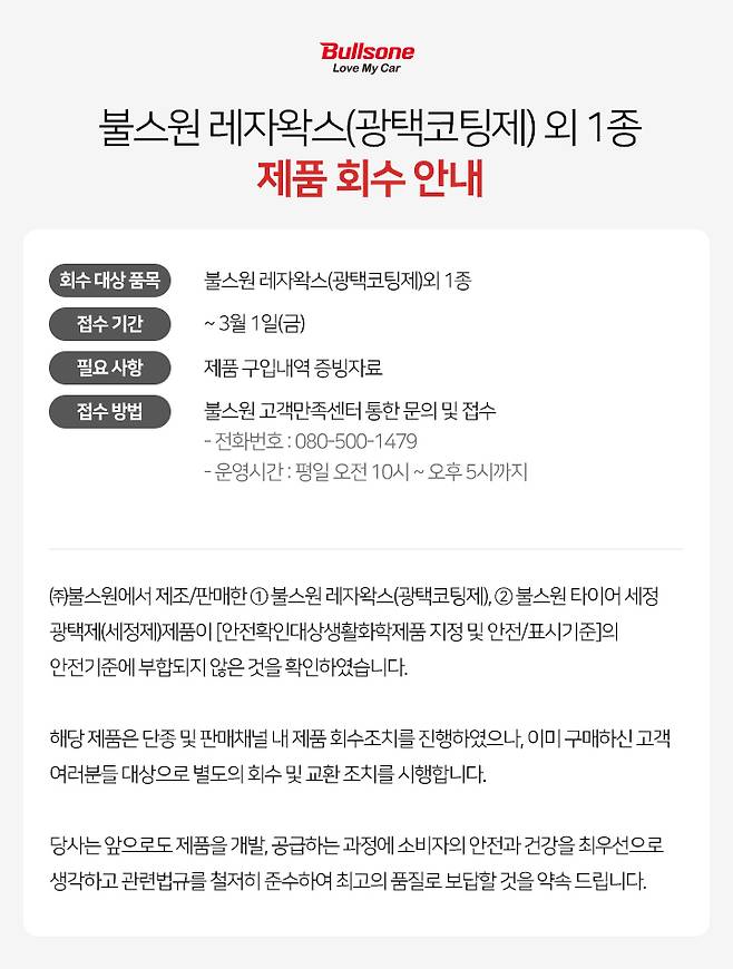 환경부와 카매거진 취재를 종합하면 ▲불스원 타이어 세정광택제 ▲불스원 레자왁스 2종에서 메틸이소티아졸리논(MIT)이 검출됐다. 이에 환경부는 생활화학제품 및 살생물제의 안전관리에 관한 법률에 따른 안전기준 위반으로 해당 제품에 대한 제조 및 판매를 금지하고 회수 처분을 내렸다.