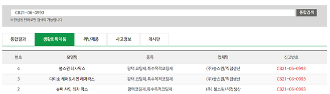 환경부는 해당 제품의 위반사항에 대해 “신고번호 제CB21-06-0993호 사용한 제품은 모두 유통 금지”로 안내했다. 생활화학제품 신고번호 제CB21-06-0993에 해당하는 제품은 ▲불스원 레자왁스 ▲다이소 케어&샤인 레자왁스 ▲슈퍼 샤인 레자 왁스 총 3종이다.