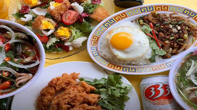 메뉴는 다양하고 각양각색인데, 그 중에서도 짜조와 돼지고기 덮밥, 그리고 얼큰한 소고기 쌀국수가 특히 인기가 많습니다.