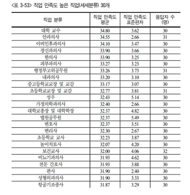 보고서에 따르면 사회적 평판, 고용 안정성, 발전 가능성, 근무 조건 등을 포함한 만족도(40점 만점)가 가장 높은 직업은 대학교수(34.80점)였다. 이어 안과의사(34.55점), 이비인후과의사(34.10점), 정신과의사/한의사(각 33.90점), 피부과 의사(33.27점) 순이었다.
