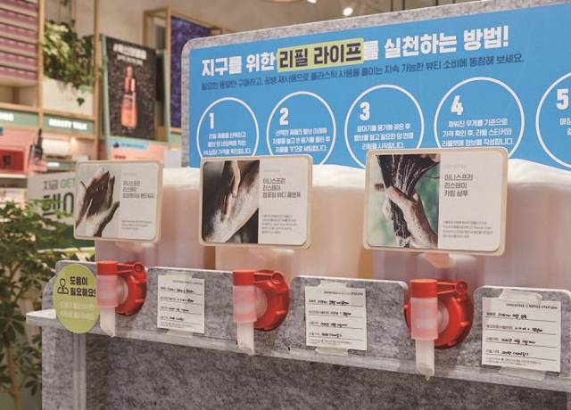 아모레퍼시픽은 2020년 10월 국내 화장품업계에선 최초로 ‘리필 스테이션’을 시작했습니다.아모레퍼시픽 계열사인 이니스프리가 운영하는 리필 스테이션에선 소비자가 가져온 재사용 용기에 내용물을 원하는 만큼 담아서 구매할 수 있습니다. 10g 단위까지 작게 나눠 필요한 양을 가져갈 수 있을 뿐 아니라 기존 제품에 비해 가격이 40%나 저렴합니다.