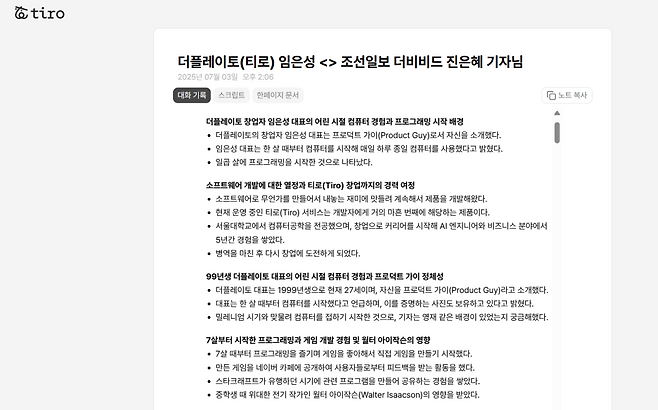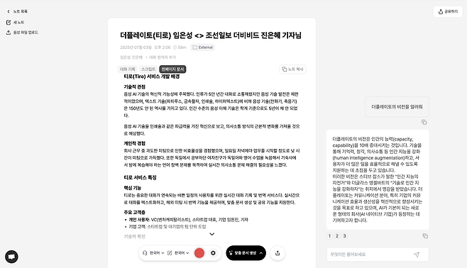 티로의 핵심은 ‘받아쓰기’가 아니라 ‘구조화’에 있다. “기존 생산성 도구 대부분 음성을 텍스트로 바꿔주는 데 그쳤어요. 텍스트가 틀리면 결국 사용자가 다시 타이핑해야 하죠. 티로는 다릅니다. 대화 내용을 텍스트로 바꾼 뒤, 그 맥락을 읽어 내용을 구조화 합니다. 대화를 1~2분 단위로 주제별로 나눠서 보여주기 때문에 소화하기 쉬워요. 텍스트 원문, 구조화된 내용, 요약본까지 한눈에 볼 수 있죠. PDF나 워드, 링크로도 바로 공유할 수 있습니다. 회의나 교육 끝난 뒤 따로 정리하는 시간을 줄일 수 있어요.”