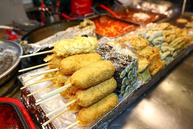 헌트릭스 멤버들이 김밥, 순대, 어묵, 호떡까지 정신없이 맛보던 장면! 명동 거리 곳곳에서 서울 대표 길거리 음식을 실제로 즐길 수 있어요.