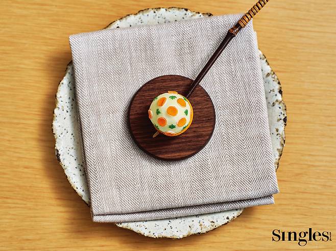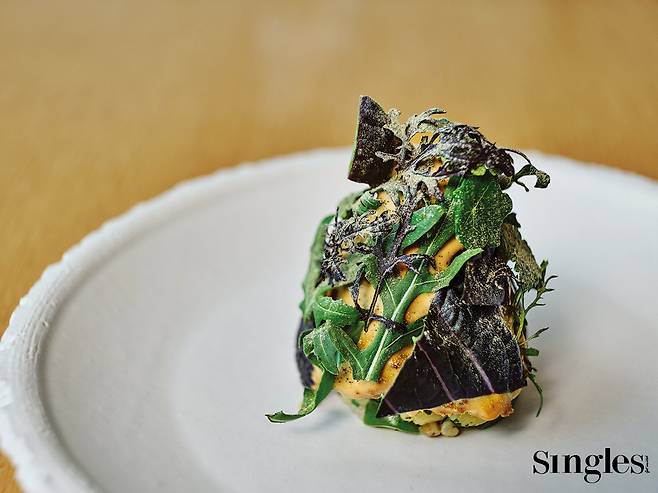 올봄 성시우 셰프가 선보이는 ‘베지꼬치’는 금귤이 주재료다. 제철을 맞은 금귤은 해마다 철이 짧아져 먼 훗날 사라질 수도 있는 슬픈 사연을 가진 식재료. 성시우 셰프는 채소만으로도 다채로운 색감과 모양을 표현할 수 있음을 보여주기 위해 담음새에 특히 심혈을 기울인다. 베지꼬치는 금귤을 가볍게 익혀 속을 파내고 옥수수크림을 채워 만든다. 그 위에 당근과 처빌을 올려 섬세하게 마무리 했다. 성시우 셰프는 손님들에게 잘 구운 스테이크로 감동을 줄 때 보다 채소 요리로 행복감을 선사했을 때 벅찬 감정을 느낀다고 말한다. 또 대중에게 채소만으로도 풍요로운 미식 경험을 제공하는 것이 앞으로 셰프가 할 일이라고도 덧붙였다. 단순히 미식을 즐기는 것을 넘어 자연과 조화를 이루며 지속 가능한 미식 경험과 문화를 제시하는 것. 레귬의 비건 요리는 채식주의자가 아닌 사람들의 입맛을 사로잡기에도 충분하다.