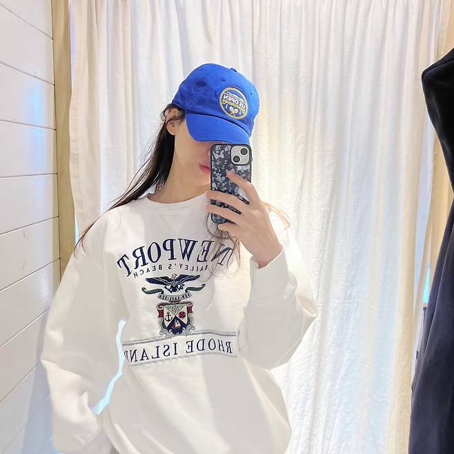 선명한 블루 컬러의 볼캡과 화이트 스웨트셔츠를 매치해 경쾌한 캐주얼룩을 선보였다. 스웨트셔츠 중앙의 클래식한 문양과 레터링 자수는 프레피한 무드를 더하며, 얼굴을 가리는 캡은 편안하면서도 힙한 분위기를 연출한다. 전체적으로 활동적이면서도 스타일리시한 감각이 돋보인다.