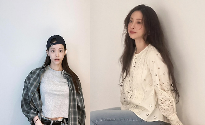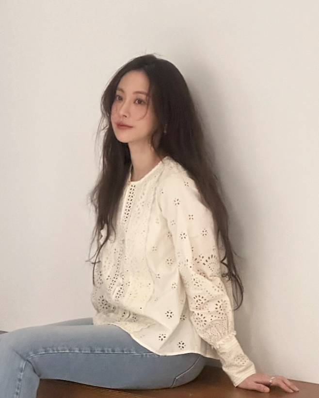 아이보리 컬러의 아일렛 펀칭 블라우스와 데님 팬츠를 조합하여 청순하고 여성스러운 매력을 발산했다. 소매와 몸판 전체에 정교하게 수놓인 플라워 패턴의 펀칭 디테일은 로맨틱한 분위기를 극대화한다. 자연스럽게 흐르는 듯한 핏의 블라우스는 과하지 않으면서도 세련된 포인트를 준다.