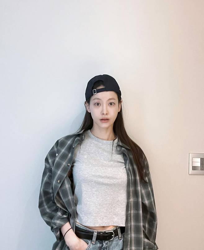 회색 크롭 티셔츠 위에 오버사이즈 체크 셔츠를 걸쳐 90년대 스트리트 패션을 연상시키는 룩을 완성했다. 셔츠를 오픈하여 자연스럽게 연출했으며, 뒤로 돌려쓴 블랙 볼캡으로 힙하고 자유분방한 분위기를 강조했다. 여기에 워싱이 들어간 데님 팬츠를 매치하여 편안하면서도 개성 있는 스타일을 보여주었다.