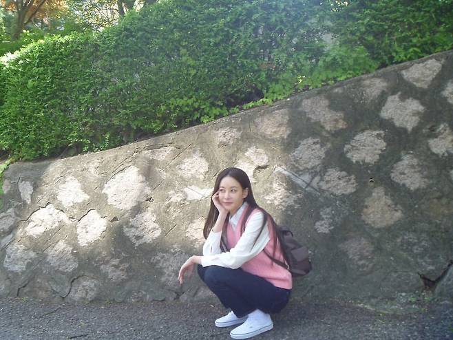 화이트 셔츠에 화사한 핑크 컬러의 니트 조끼를 레이어드하여 사랑스러운 프레피룩을 연출했다. 단정한 셔츠와 브이넥 니트의 조합은 깔끔하면서도 발랄한 인상을 준다. 어두운 색상의 팬츠와 기본 스타일의 흰색 스니커즈, 백팩을 함께 착용해 활동성을 높인 캠퍼스룩의 정석을 보여준다.