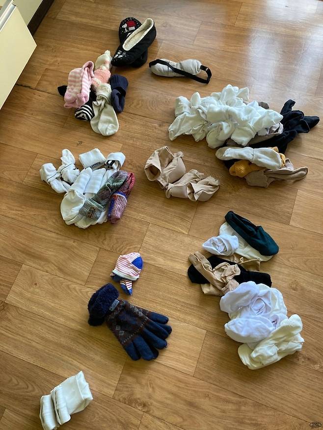 나는 운동 양말, 일반 양말, 두꺼운 양말, 덧신 이렇게 크게 덩어리 지어서 나누고 목이 늘어난 발목 양말 한 개를 버리고 장갑&안대를 다른 곳에 수납했다.