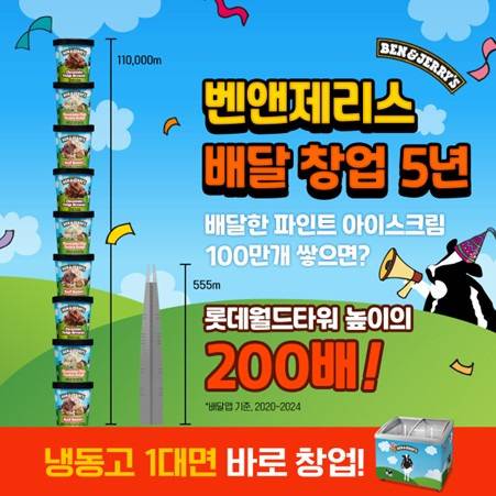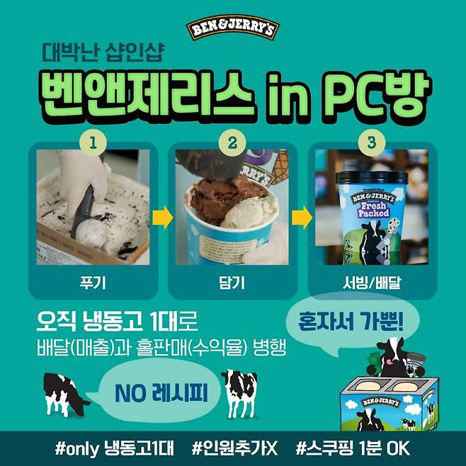성중헌: 벤앤제리스 배달전문점 창업이 괜찮은 게, 샵인샵 개념이라 망할 게 없어요. 기존에 배달하던 점주가 자투리 공간에 냉동고 하나 놓으면 끝이에요. 레시피나 기술도 전혀 필요 없어요. 배스킨라빈스도 그렇듯, 냉동고에서 아이스크림 퍼담고, 그걸 보냉팩에 넣어 배달원 전달하면 끝이죠.