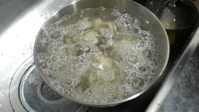 필요한 재료는 생굴, 간 무, 천일염 3가지다. 먼저 생굴의 껍질을 손으로 제거한 후, 간 무와 천일염을 넣고 잘 섞는다.