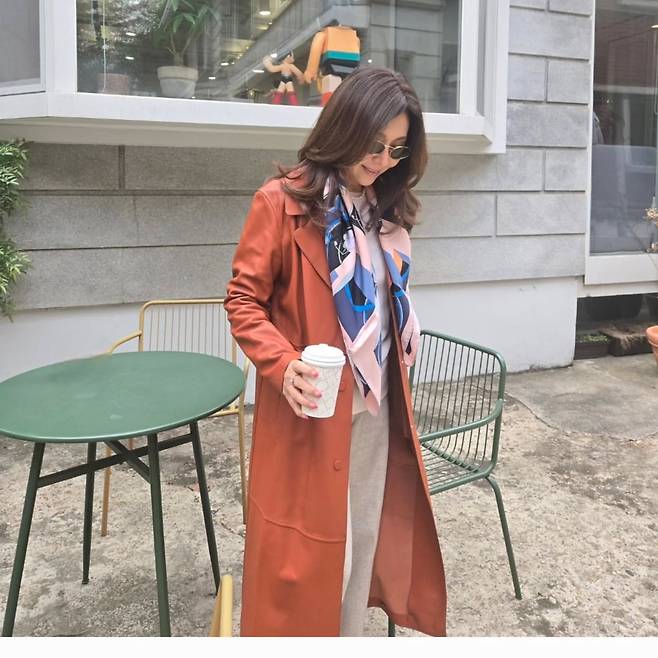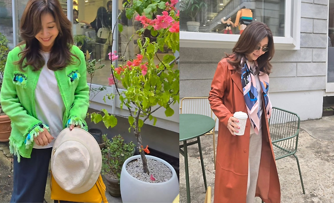 세련된 테라코타 컬러 코트를 입은 최명길이 카페에서 여유로운 분위기를 자아내고 있다. 따뜻한 오렌지 브라운 계열의 롱 코트는 봄철 외출복으로 안정감 있는 스타일을 연출하며, 내부에 매치한 파스텔 톤의 스카프는 화사한 포인트가 되고 있다. 선글라스로 세련미를 더했으며, 한 손에 든 테이크아웃 커피는 일상 속 여유를 담고 있다. 그린 테이블과 의자가 있는 카페 테라스에서 최명길은 도시적이면서도 편안한 스타일링으로 봄 시즌 데일리 룩의 정수를 보여주고 있다.