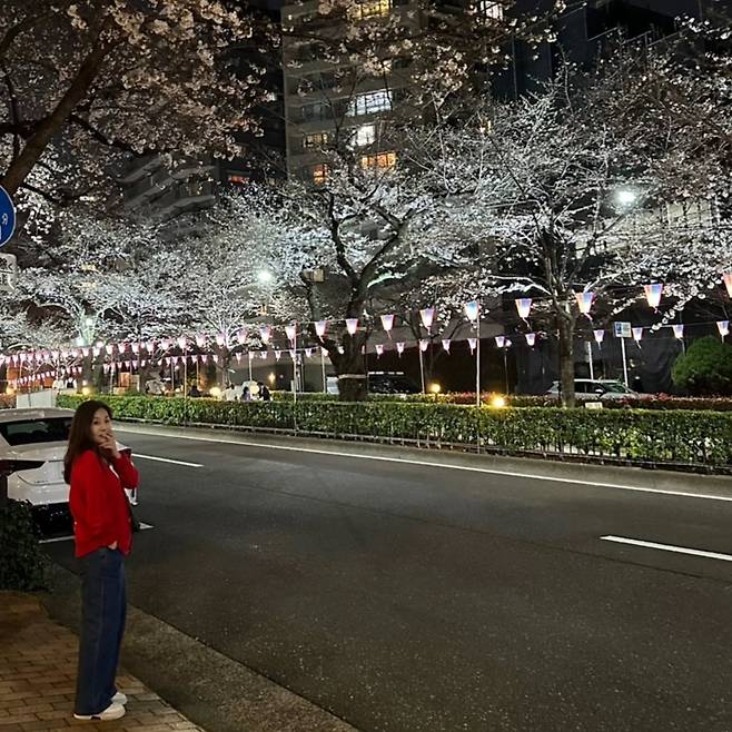 야간 벚꽃 아래에서 최명길이 선명한 레드 재킷으로 시선을 사로잡았다. 화려한 벚꽃 조명과 어우러진 레드 컬러는 야간의 분위기를 한층 돋보이게 만들고 있다. 캐주얼한 데님 팬츠와 화이트 스니커즈로 편안함을 더했으며, 이는 도시적인 밤 산책 룩으로 완벽하게 조화를 이루고 있다. 은은하게 빛나는 벚꽃 아래에서 최명길은 자연스러운 포즈로 봄밤의 낭만을 고스란히 담아내며 계절감을 살린 패션 센스를 뽐내고 있다.