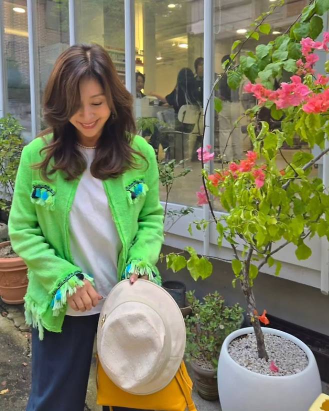 배우 최명길이 화사한 연두색 카디건으로 봄의 생기를 담아냈다. 눈에 띄는 선명한 연두색 카디건은 프린지 디테일과 독특한 아이 모티프 장식으로 포인트를 주었다. 내부에는 심플한 화이트 티셔츠를 매치해 산뜻함을 더했으며, 네이비 팬츠로 하의를 단정하게 마무리했다. 손에 든 베이지 컬러 모자는 전체적인 스타일에 자연스러운 여유를 더하고 있다. 꽃이 만개한 화분 앞에서 포즈를 취한 최명길은 봄의 생동감을 패션으로 표현하며 밝은 미소로 화사함을 배가시키고 있다.
