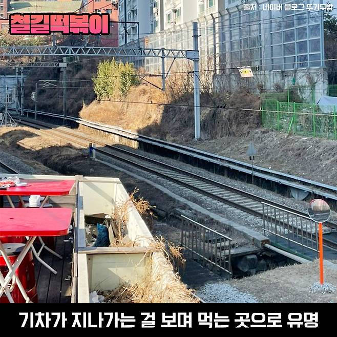 철길떡볶이는 '야외 테이블에 앉아 있으면 철길에 기차나 지하철을 지나가는 장면을 보면서 먹을 수 있는 영화 속에 나올 법한 느낌'의 떡볶이집이라고 소개되었어요.