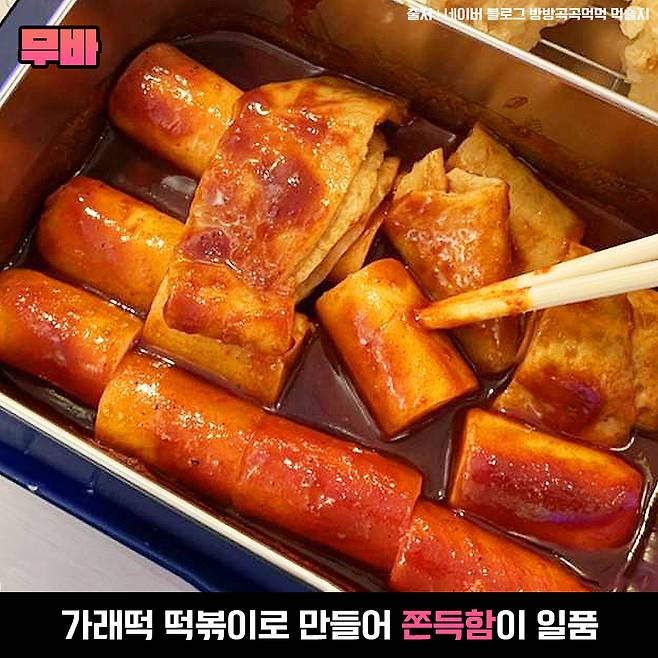 가래떡으로 떡볶이를 만들어 쫀득함은 물론이고 가위로 잘라 무바 소스에 듬뿍 발라 먹으면 자극적인 소스여서 너무나도 잘 어울린다고 해요.