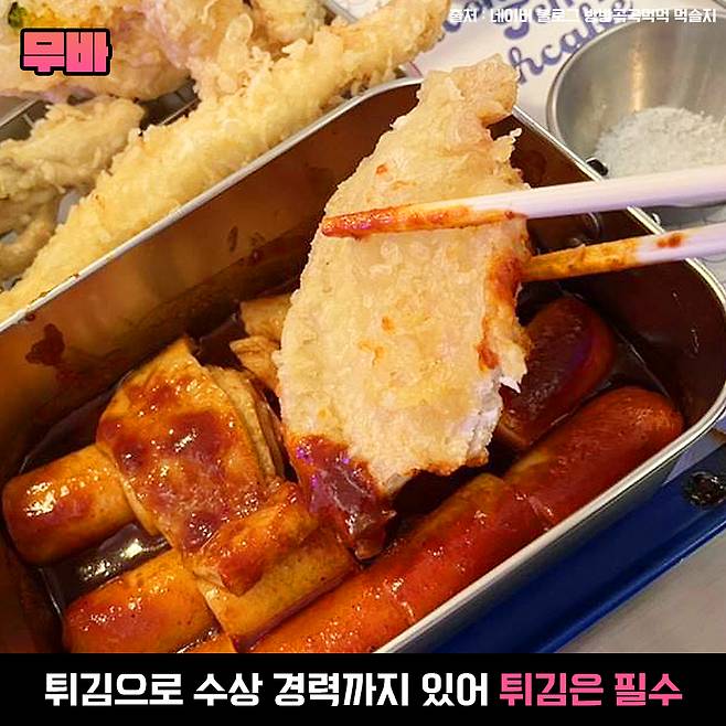무바 사장님께서 일본에서 요리 관련된 학교를 나오고 튀김으로 대회 수상 경력까지 있어서 튀김으로도 유명하다고 해요. 튀김과 떡볶이의 조합은 환상적인데 두 개 다 성공적이라 두 가지 모두 먹고 오는 걸 추천드립니다!