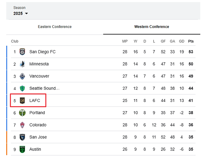 서부 컨퍼런스에서는 올해 신생 구단으로 출범한 샌디에이고 FC가 승점 53점으로 단독 선두를 기록하며 돌풍을 일으키고 있습니다. 손흥민 선수가 속한 LAFC는 승점 41점으로 서부 5위에 올라 있으며, 플레이오프 진출을 두고 치열한 경쟁을 이어가고 있습니다. 손흥민의 합류 이후 공격력이 크게 강화된 만큼, 남은 경기에서 추가 상승세를 기대할 수 있습니다.
