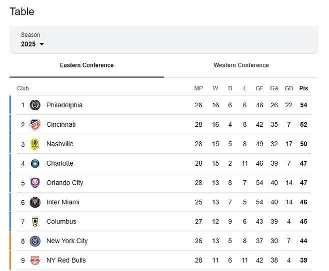 2025년 8월 25일 기준 MLS는 시즌 후반부에 접어들며 순위 경쟁이 치열하게 이어지고 있습니다. 동부 컨퍼런스에서는 필라델피아 유니온이 승점 54점으로 선두를 지키고 있으며, FC 신시내티가 승점 52점으로 그 뒤를 바짝 추격하고 있습니다.