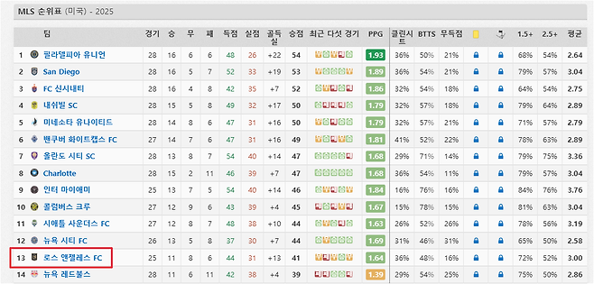 서부 컨퍼런스에서는 올해 신생 구단으로 출범한 샌디에이고 FC가 승점 53점으로 단독 선두를 기록하며 돌풍을 일으키고 있습니다. 손흥민 선수가 속한 LAFC는 승점 41점으로 서부 5위에 올라 있으며, 플레이오프 진출을 두고 치열한 경쟁을 이어가고 있습니다. 손흥민의 합류 이후 공격력이 크게 강화된 만큼, 남은 경기에서 추가 상승세를 기대할 수 있습니다.