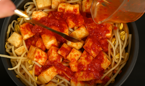 냄비에 양파→콩나물→두부 순으로 올린 뒤 양념장을 부어줍니다.뚜껑을 닫고 중불에서 6~7분 찜 (중간에 뚜껑 열지 마세요!)