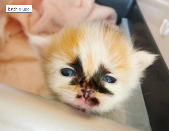이상하게도 한 아기 고양의 얼굴을 아무리 털어도 먼지가 사라지지 않았습니다.