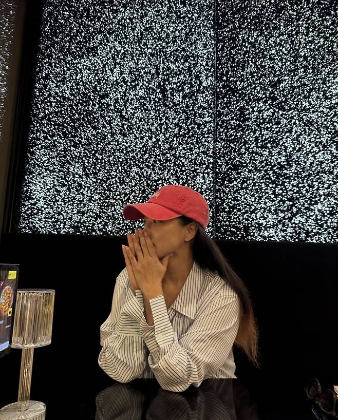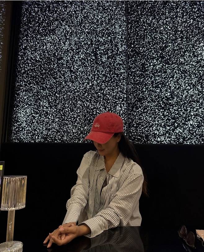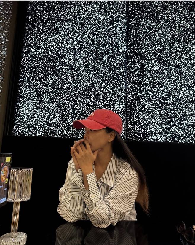 김희선은 스트라이프 셔츠에 강렬한 레드 캡모자를 매치해 시선을 사로잡았습니다.