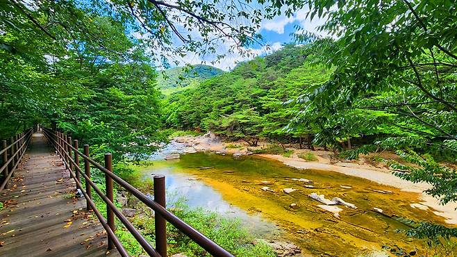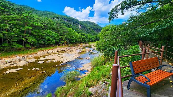 길 곳곳에는 나무 데크와 쉼터가 잘 조성되어 있어 중간중간 쉬어가기도 좋고, 계곡 위로 놓인 다리를 건너며 물살을 가까이서 바라보는 재미도 쏠쏠합니다.