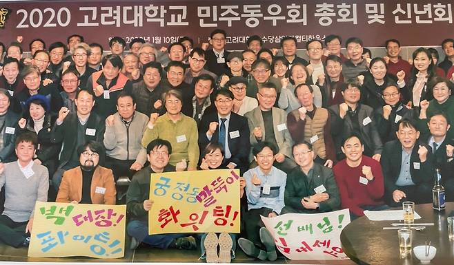 | ▲ 백완승이 막바지 투병 중이던 2020년 1월, 고려대 민주동우회 신년식에서 동문들이 백완승의 쾌유를 빌며 “백대장 파이팅”, “궁정 말둑이 파이팅” 등이 적힌 패널을 들고 응원했다. |