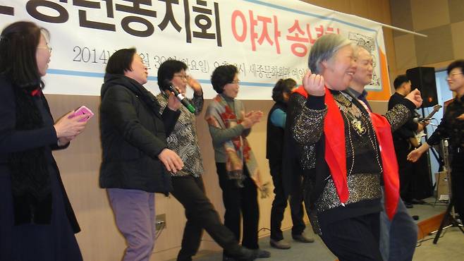 | ▲ ‘민청련동지회 야자 송년회’에서 회원들과 춤을 추는 백완승 |